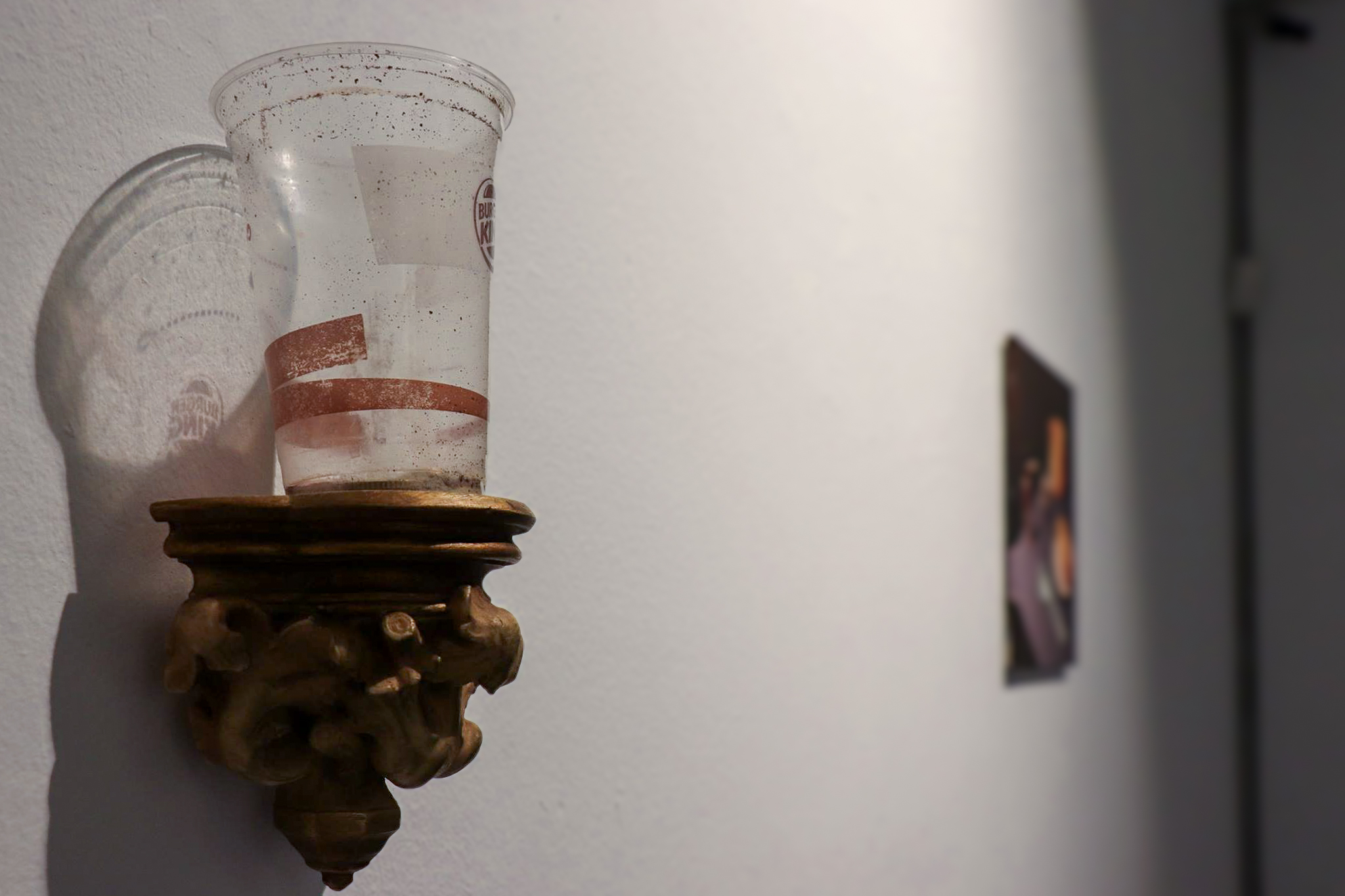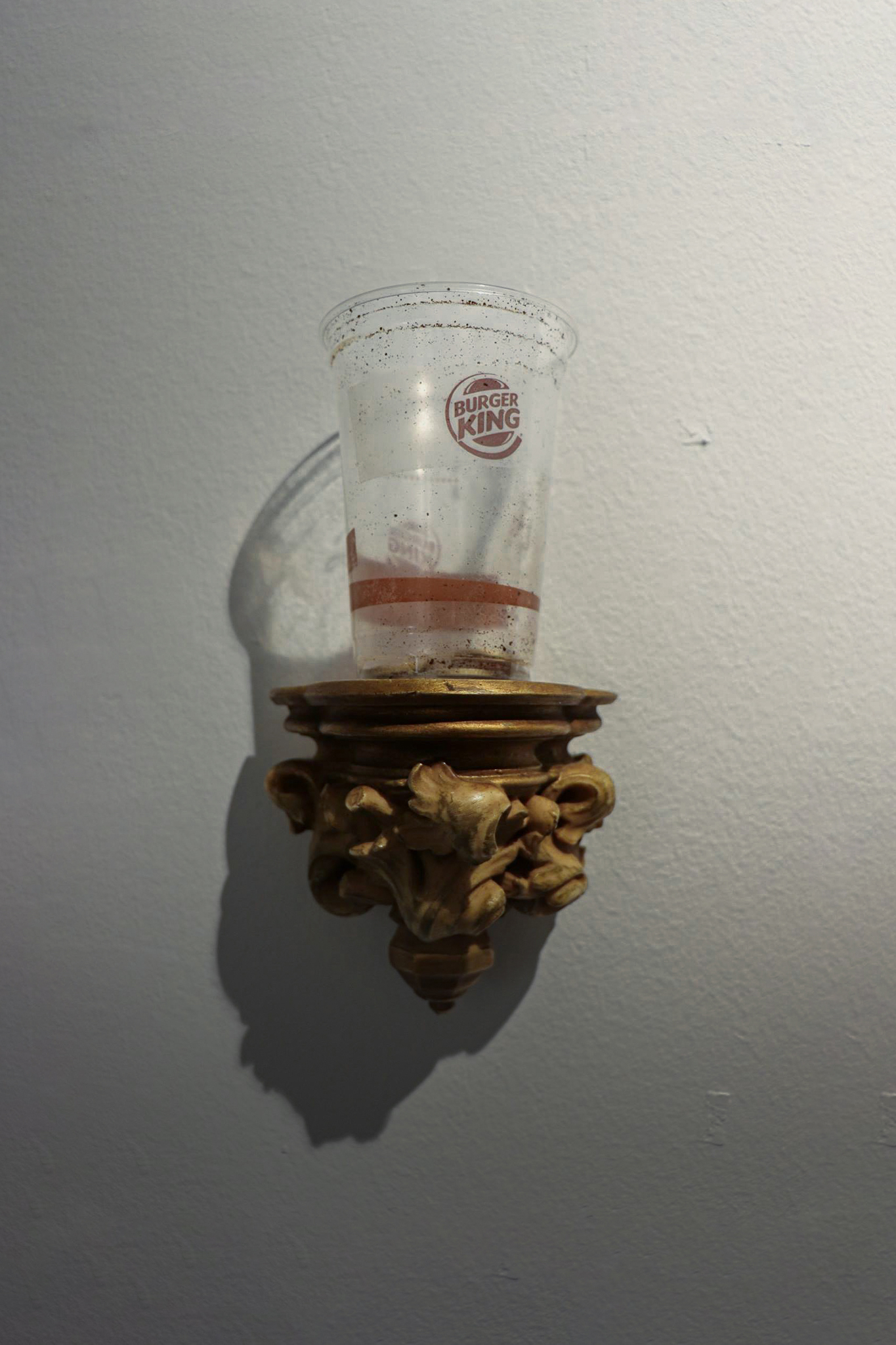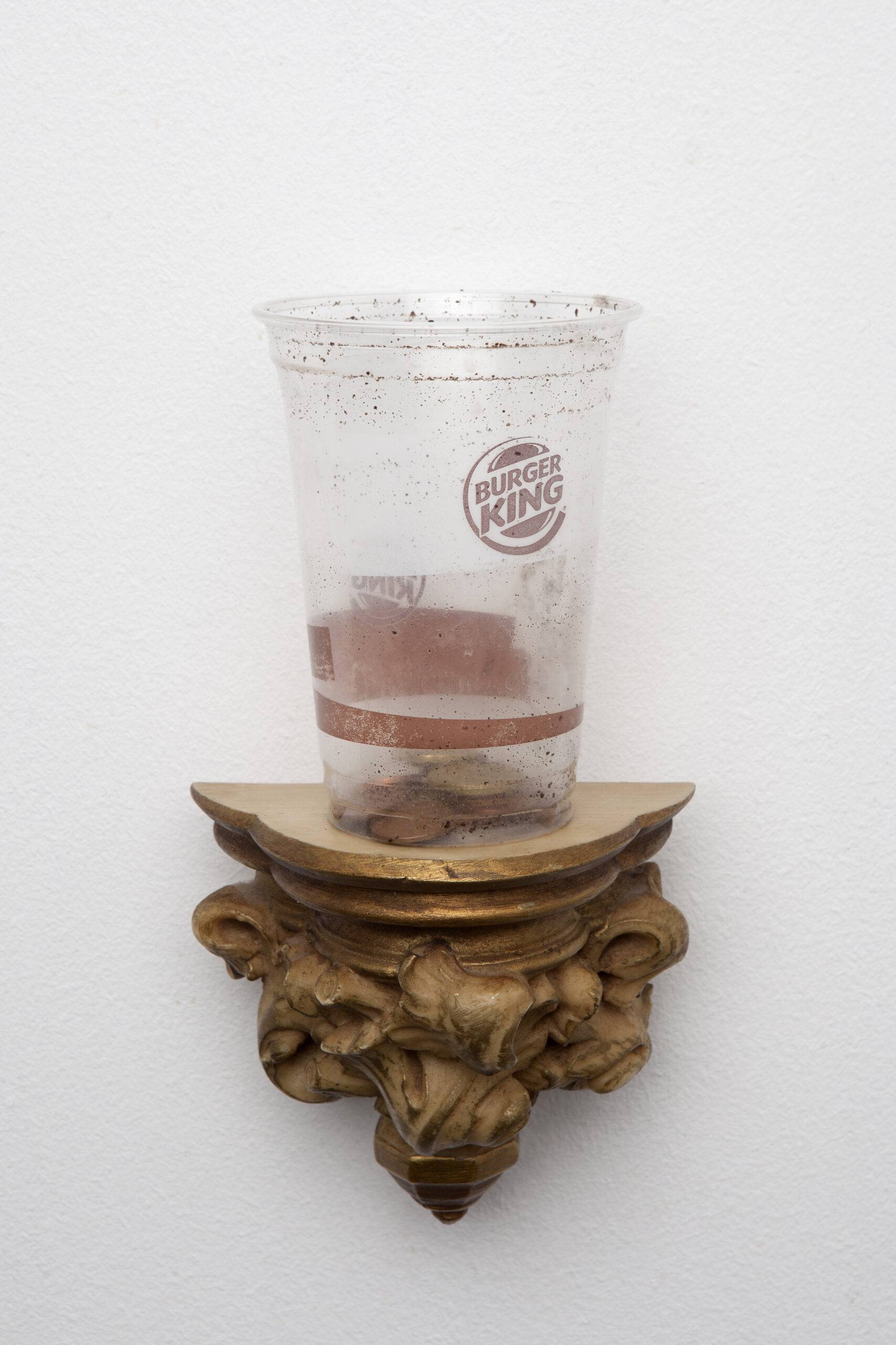 La pieza Caritas consiste en un vaso de plástico comprado en la calle a una persona que pedía dinero con él.