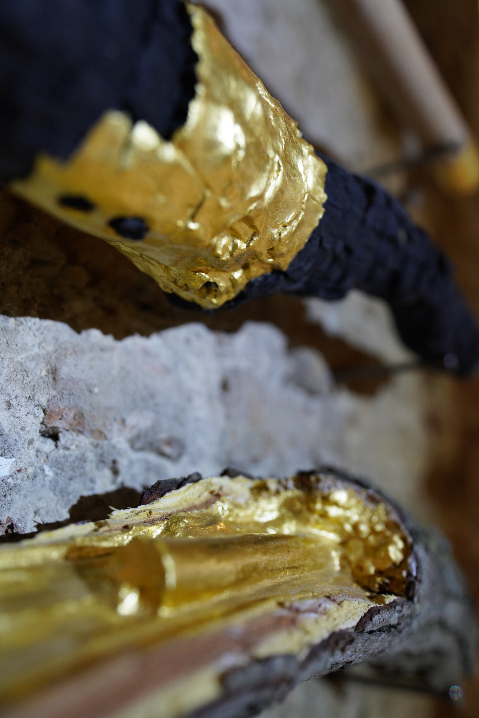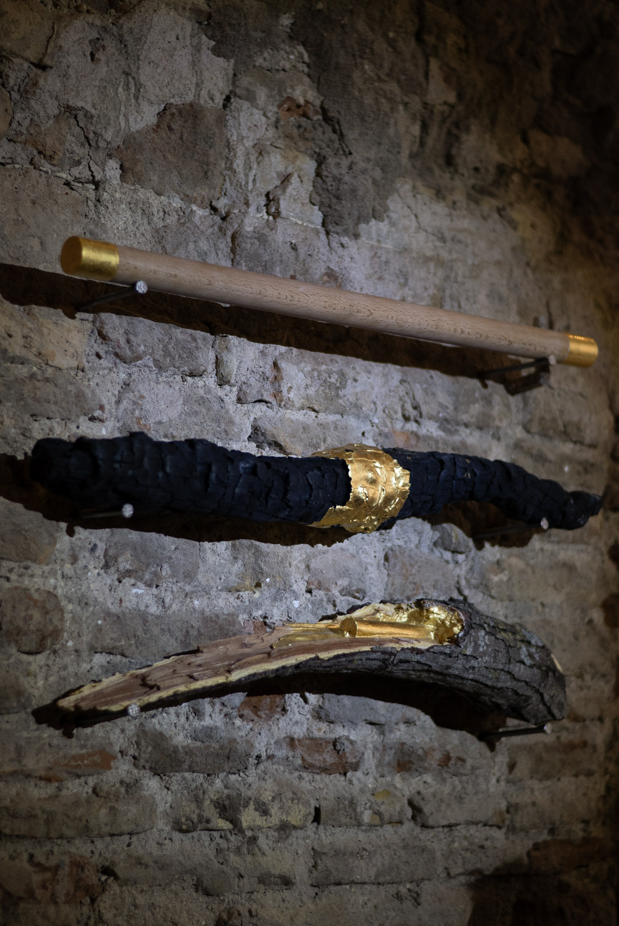 En esta pieza encontramos tres palos que han sido dañados de una forma u otra. Una rama carbonizada encontrada tras un incendio. Otra rama caída tras un vendaval. Por último tenemos un palo cortado y torneado hasta dejar un acabado cilíndrico perfecto.